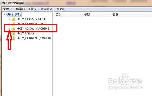 4,进入注册表,找到“HKEY_LOCAL_MACHINE”,请依据下图指示,点击红色框内,箭头所示的文件夹前的三角按钮