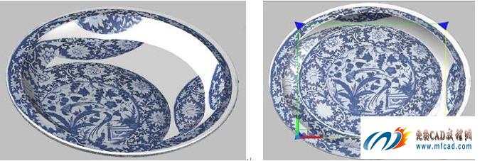 对盘底的图案要调整到位,那就击“贴图/平面贴图”功能,并按住Ctrl键激活盘底线圈,就可看到四角带“▲”形的放缩框,将其框住盘底,图案就归正了。接着,再对盘身图案调整到位,方法相同,归正的图示如插图4左所示。最后,对盘上边的圆环图案也调整到位。