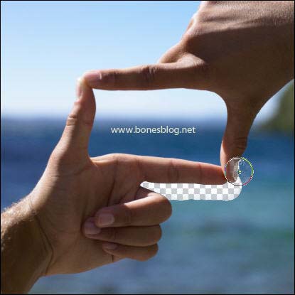 按Ctrl+Z退回上一步,再次在画面中使用背景橡皮擦工具,结果不错。那我们分析一下,这两次为什么参数没有改变,却有不同的变化呢?注意一下背景橡皮擦的光标,光标中间有一个“+”的坐标,当“+”光标位置在要擦除的位置上的时候,就能擦出比较好的效果。 |