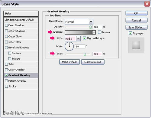 2、双击图层,添加渐变叠加样式,模式正常,样式径向,缩放120%。
