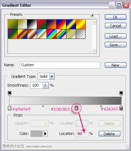 3、创建一个三色的渐变(可以通过点击色标滑块添加颜色),左侧颜色为#e9e9e9,右侧为#636363,中间颜色为#b3b3b3,确保中间颜色的位置是60%。