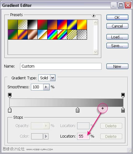 4、点击中间滑块添加颜色#b3b3b3时,会出现两个小方格,一左一右,点击右侧的一个,位置调整为55%。