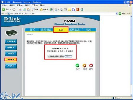 (1)打开浏览器,在地址栏键入192.168.0.1,登录到D-LINK路由器WEB管理界面(默认状态下用户名为admin,密码为空),进入配置界面后,点击上面工具菜单,然后点击左侧的韧体更新按钮;