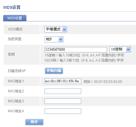 开启A路由器的WDS中继模式,加密方式选择一个,密钥填写正确,频道选择一个(不能自动选择)扫描,扫描AP,找到B路由器的SSID,连接,保存,重启。