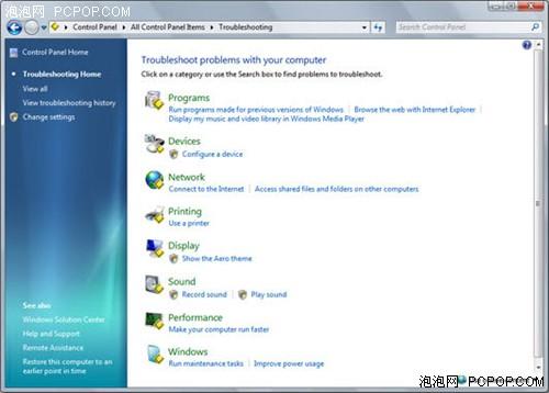 据微软全球技术支持中心亚太区总经理柯文达先生介绍, 微软此次的windows 7开发离不开客服技术部的众多意见反馈,微软开发人员把这些用户最常遇见的问题直接“教”给了windows 7,因此windows 7能帮助用户解决大量用户而不必人工参与,微软在提高客服技术部工作效率的同时也极大地方便了用户。打开你的Windows 7控制面板,找到疑难问题解答入口(英文版Windows 7中称为Troubleshooting),打开后你将看到无论遇见从软件到硬件,再到网络和系统安全一系列问题都可以先交给Windows 7来自行解决。