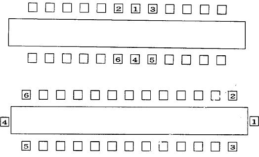席次的高低与桌次的高低原理基本相同,即右高左低,先右后左。主宾应安排在第一主人的右侧,副主宾应安排在第二主人的右侧,以此类推。如有夫人同桌就坐,按国际惯例应将男女掺插安排,第一主人的右侧和左侧安排主宾的夫妇,第二主人的右侧和左侧安排副主宾的夫妇,以此类推,但我国习惯是以个人本身职务排列,以便谈话,如夫人出席,常把女方排在一起,主宾夫人坐女主人的右侧。如遇一些特殊情况时便要灵活掌握,比如主宾身分高于主人,为表示对他的敬重,可以把主宾排在第一主人的位置,而主人则坐在主宾位置上,第二主人坐在主宾的左侧。假如需要配译员时,一般应将译员安排在主宾的右侧;同一桌上需安排第二译员时,可将其安排在第二主人右侧与第三宾客隔开的席位上。西式宴会席次的安排则有两种,见下图: