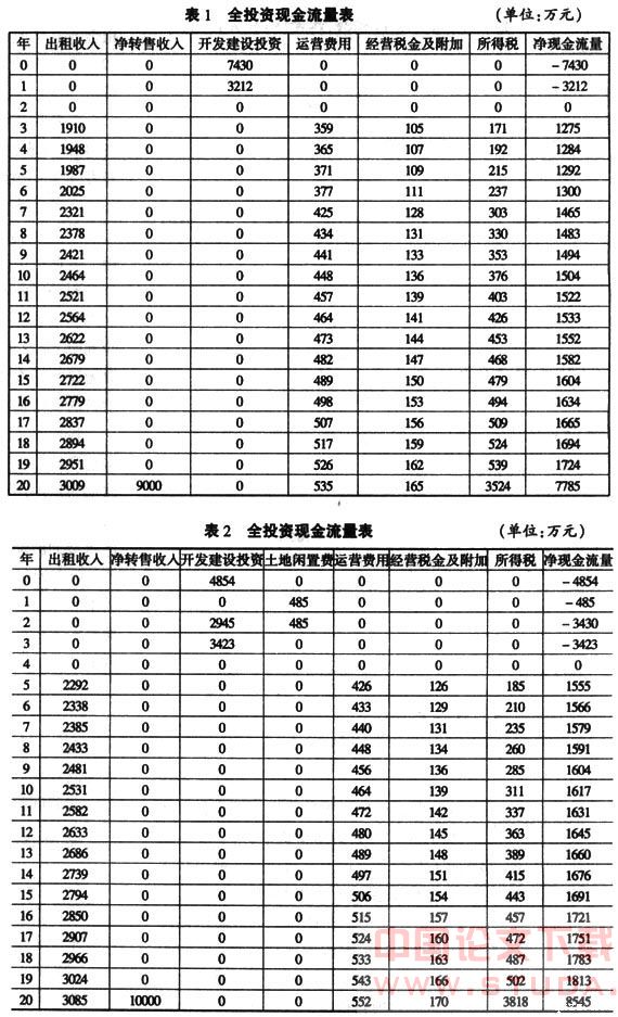 根据前面的分析,可以通过编制商业地产开发项目损益表,计算出商业地产项目在寿命期内各年的利润总额,从而可以计算出项目所要缴纳的所得税。最后根据上述数据,编制商业地产项目的全投资现金流量表,以此计算出项目的净现值。项目全投资现金流量表,详见表1。
