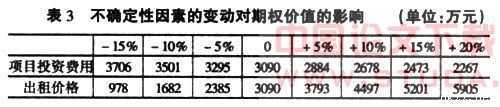 这里主要分析项目投资费用、波动率和出租价格的变化对项目期权价值的影响。假设项目投资费用和出租价格的变化率分别为+5%、+10%、+15%、-5%、-10%。不确定性因素的变动对期权价值的影响情况,见表3。