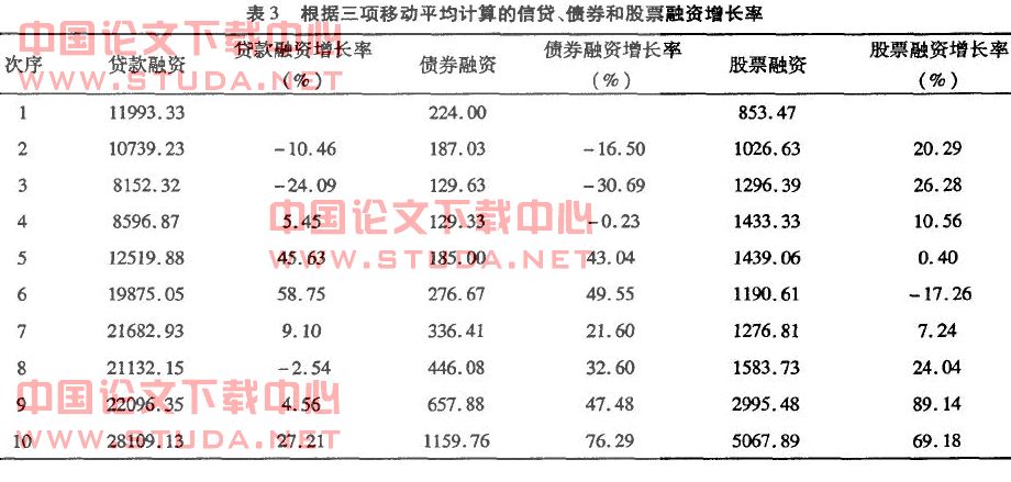 由表1可以看出,贷款融资和债券融资的增长速度大致相同,只是在前期,贷款融资上升和下降的幅度都比债券融资的要大,但在后期,贷款融资上升的幅度大大低于债券融资。这说明,债券市场的融资能力有所增强。股票的增长速度几乎与前两者是相反的,在后期有几年,三者的增长线是一致的,都是上升的,股票融资的增长还超过前两者的增长,但最后一期,股票融资没有继续增长,而是下降。三者增长的变化,基本上和表2的分析结论一致。