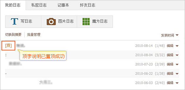 日志“置顶”可以突出它的重要性,如果您觉得这篇日志比较经典,想让好友进入日志列表后第一时间看到您的这篇日志,设置了“置顶”后在日志标题前面都会显示“顶”字,置顶的日志会排列靠前,倘若您同时置顶了多篇日志,它会按发表时间进行排序。