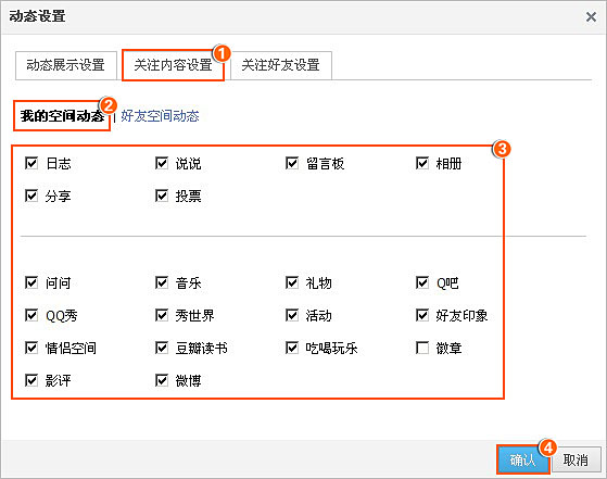 选择‘关注内容设置’,可以自定义选择您想关注好友空间的类别前打上勾,最后“确定”即可。